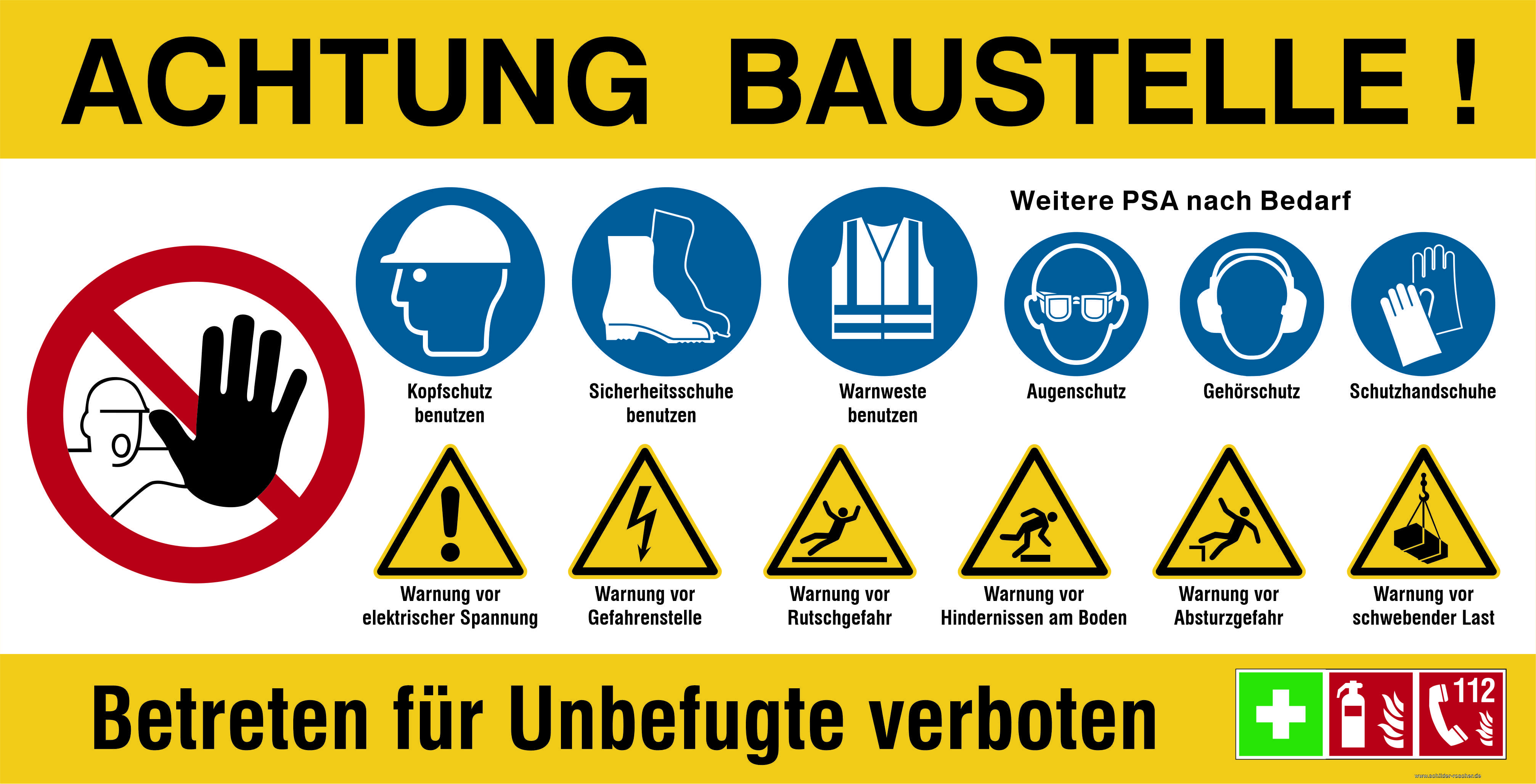 Sorgen Sie für mehr Sicherheit und klare Hinweise auf Ihrer Baustelle – mit unserem standardisierten Bauzaunbanner mit wichtigen Sicherheits-, Verbots- und Gebotszeichen. Das Banner ist bereits fertig gestaltet und enthält die gängigen Sicherheitskennzeichnungen, die auf Baustellen erforderlich sind. Dadurch kann es sofort eingesetzt werden, ohne dass individuelle Anpassungen notwendig sind.