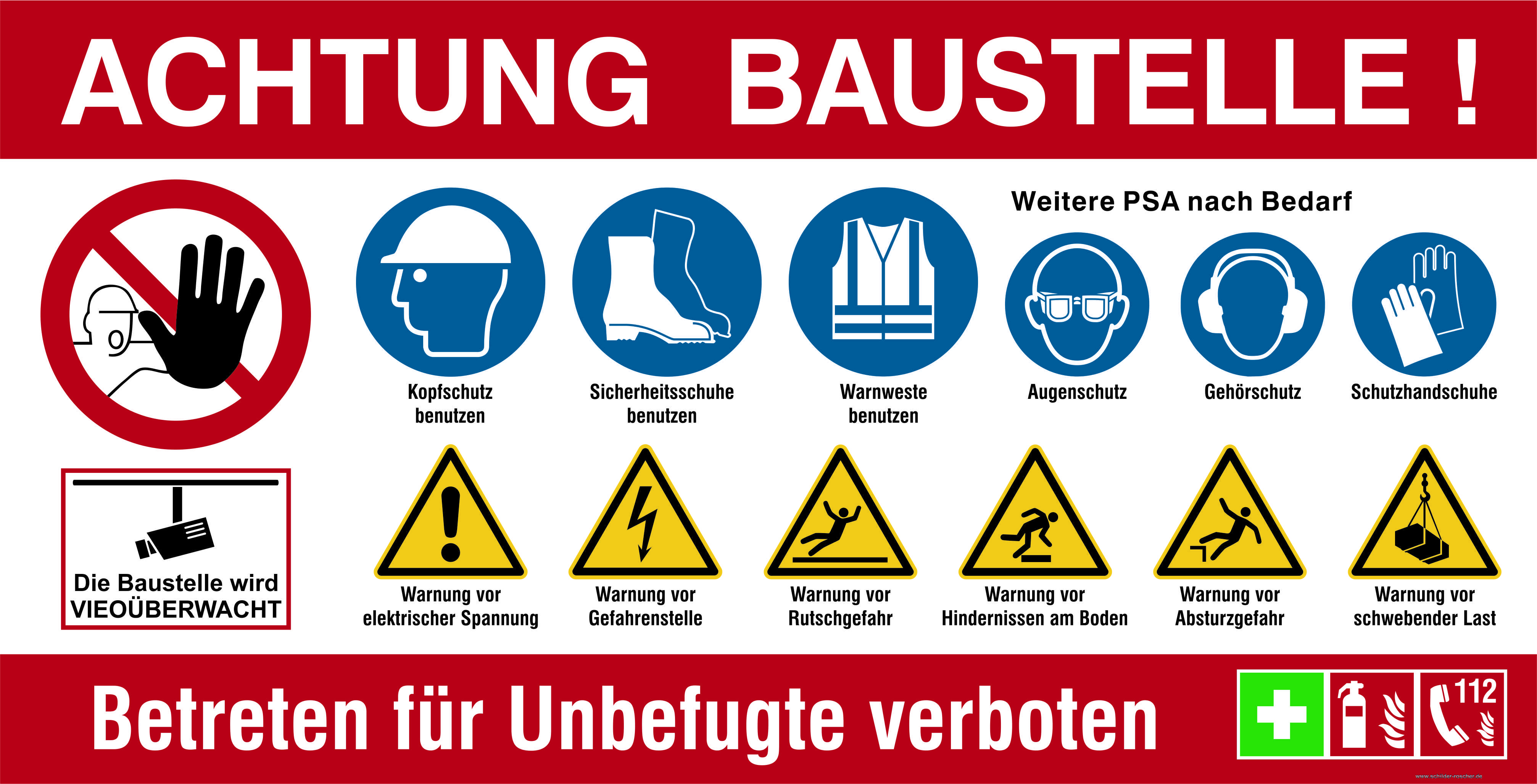 Mit unserem Bauzaunbanner mit Hinweis auf Videoüberwachung sorgen Sie für klare Sicherheitsregeln und eine deutlich sichtbare Kennzeichnung Ihrer Baustelle. Das Banner enthält wichtige Sicherheits-, Verbots- und Gebotszeichen sowie das gut erkennbare Symbol „Achtung Videoüberwachung“.