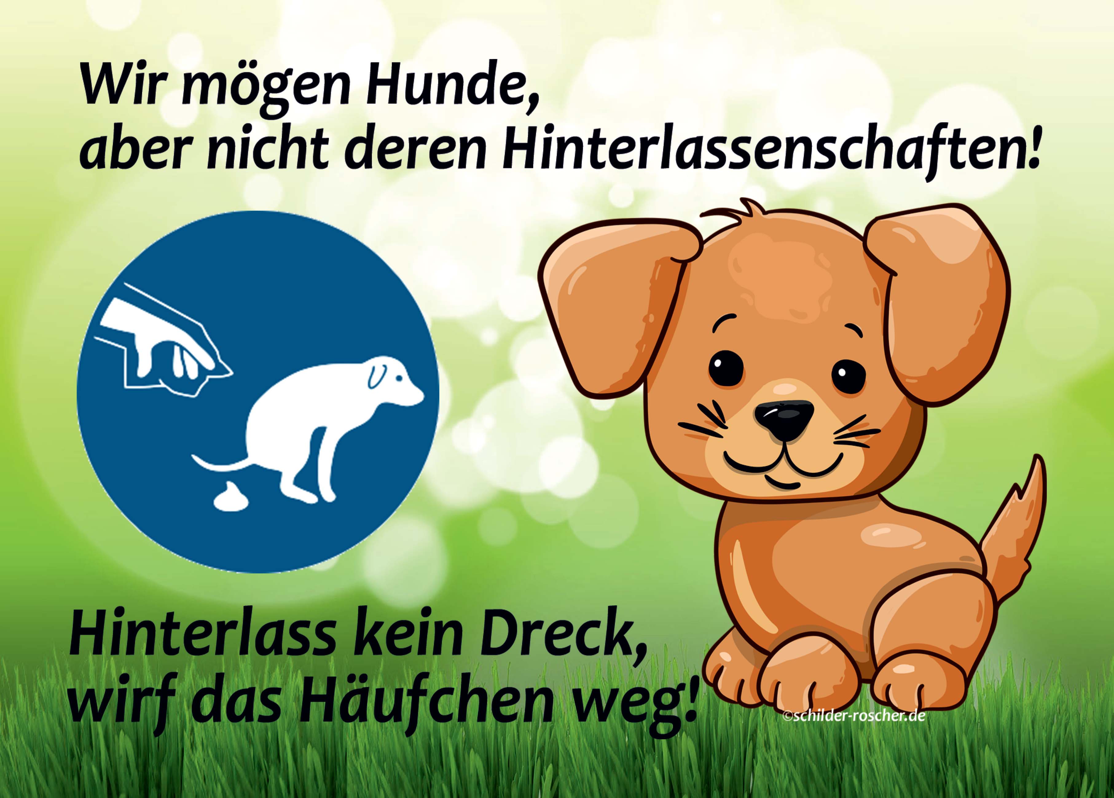 Dieses farbenfrohe und gut sichtbare Hinweisschild sorgt auf klare und freundliche Weise dafür, dass Hundebesitzer die Hinterlassenschaften ihrer Vierbeiner entfernen. Mit dem Spruch „Wir mögen Hunde aber nicht deren Hinterlassenschaften – Hinterlass kein Dreck, wirf das Häufchen weg!“ spricht das Schild eine deutliche, aber sympathische Sprache.